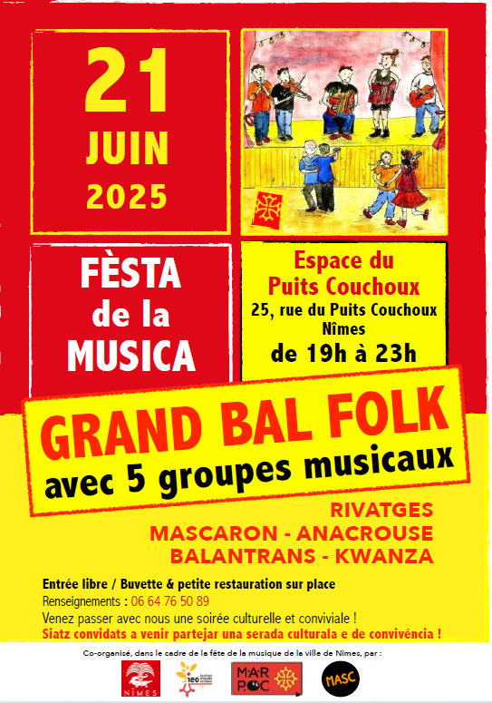 Dissabte 21 de junh, Fèsta de la Musica, scèna occitana a Nimes : Grand bal folk amb 5 grops musicals. Rivatges, Mascaron, Anacrouse, Balantrans, Kwanza.
